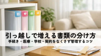 引っ越し前後に増える書類を「手続き・医療・学校・契約」の4つに分けて管理するテンプレを紹介。入れ物と置き場所、よくある失敗と対策までまとめました。