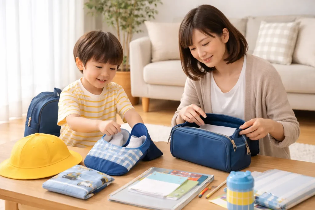 初日だけでも、前夜のうちに全部そろえておくとバタつきにくくなります。