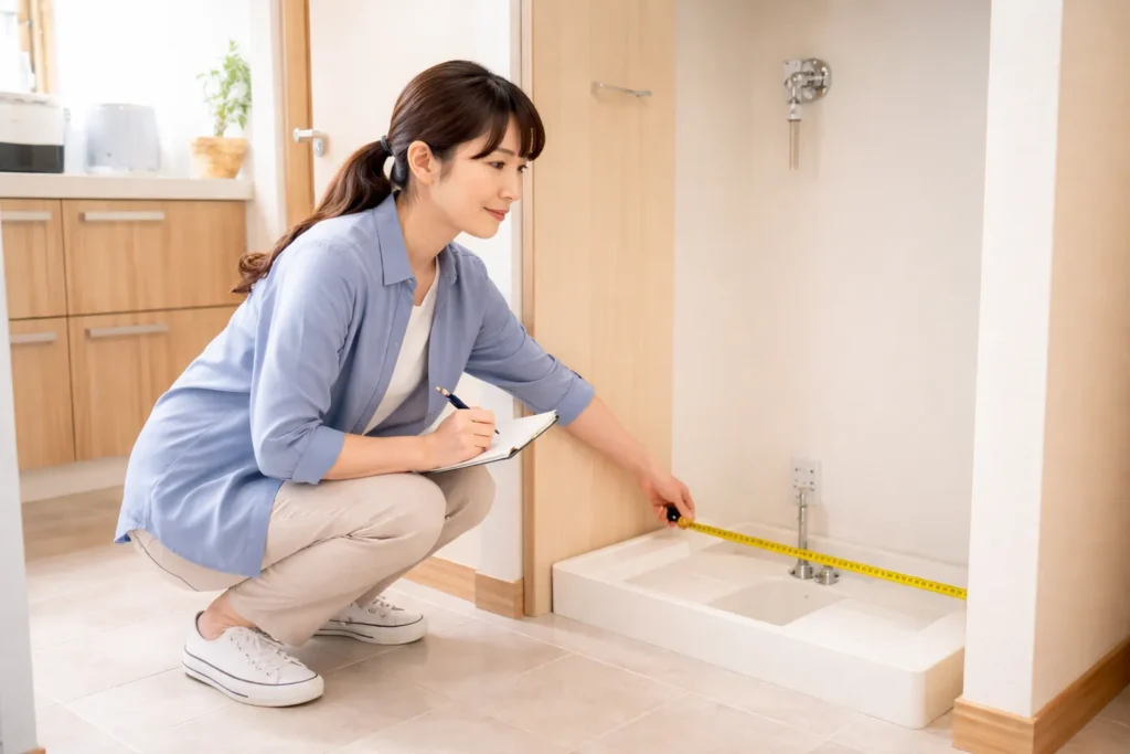 洗濯機は、サイズだけでなく水回りの位置確認が大事です。