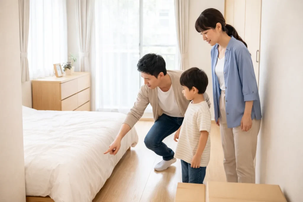 特に子どもがいる家庭では、寝室にベッドを置いたあとの動線も見ておいたほうが安心です。