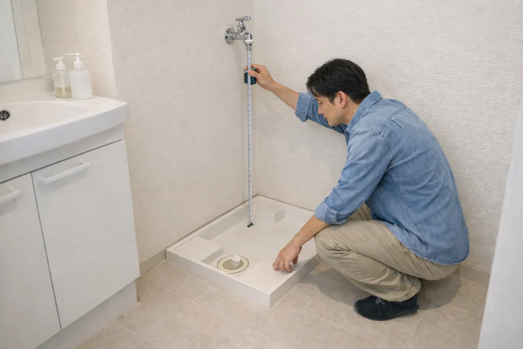 対策: 防水パンだけでなく、蛇口の高さ/排水口位置もチェック。
