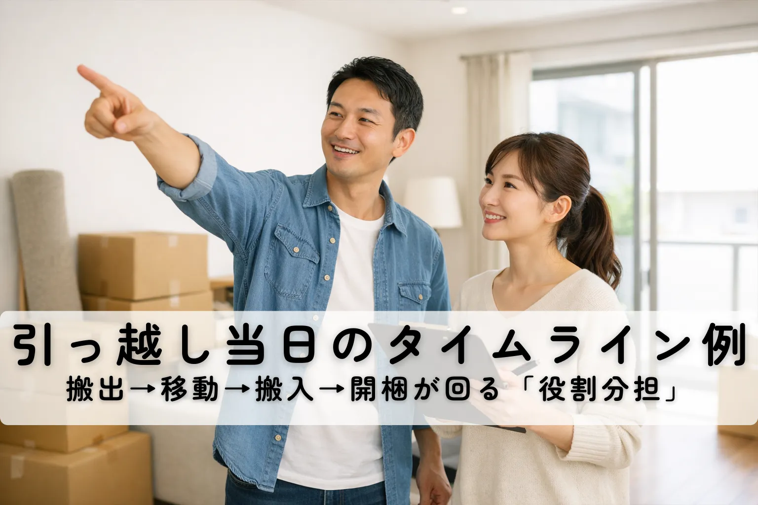 引っ越し当日のタイムライン例|搬出→移動→搬入→開梱が回る「役割分担」