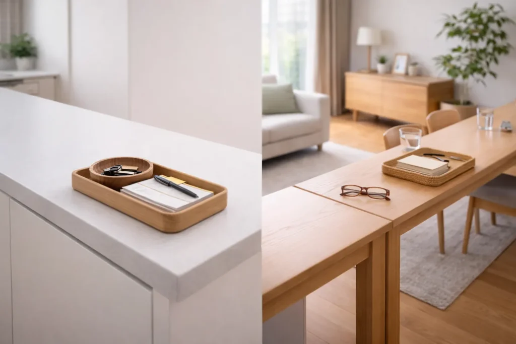 - テーブルの 手前側10〜15cmだけ を出しっぱなしOKゾーンにする