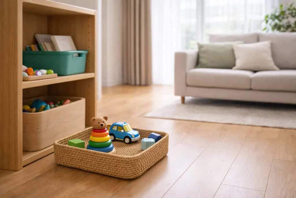 子ども専用の出しっぱなしOKゾーン を一か所決めておくと、片づけの声かけがしやすくなります。