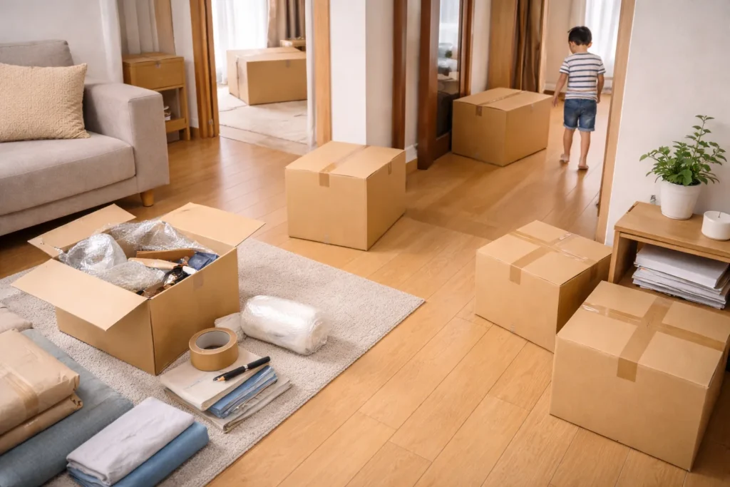 この記事では、子どもがいても生活を回しながら進められる「部屋別の荷造り順」を、チェックリストつきでまとめます。